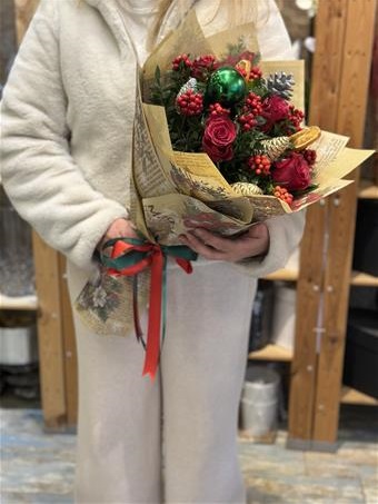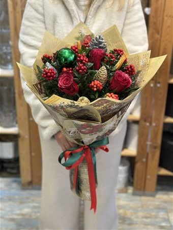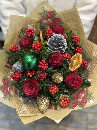 İthal Dış Ambalaj İle Bir Araya Getirilmiş 5 Kırmızı Gül 15 dal Kokina Çiçeği İle Hazırlanmıştır. 4 Adet Kozalak, 1 Yıl Başı Süsü ve Kuru Portakal Mevcut