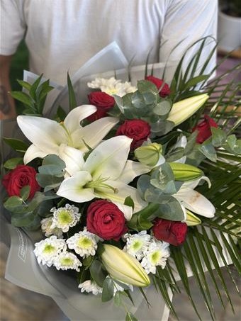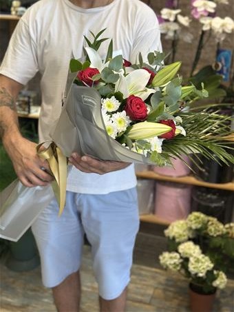 İthal Dış Ambalaj İle Bir Araya Getirilmiş Lilyum Buketidir. İçinde Lilyum, Kırmızı Güller, Papatya Ve Garnitürler Mevcuttur.