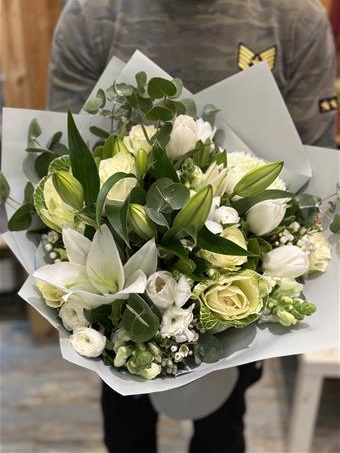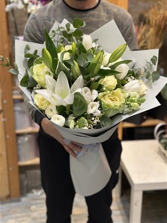 İthal Dış Ambalaj İle Bir Araya Getirilmiş Lilyum Buketidir. İçinde Lilyum, Beyaz Güller, Beyaz Laleler Ve Garnitürler Mevcuttur.