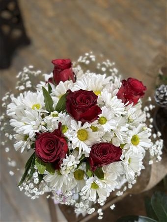 İçerinde Minimum 5 Adet Kırmızı İthal Rhodos Cinsi Güller Ve 10 Dal Beyaz Kasımpatı Bulunmaktadır.